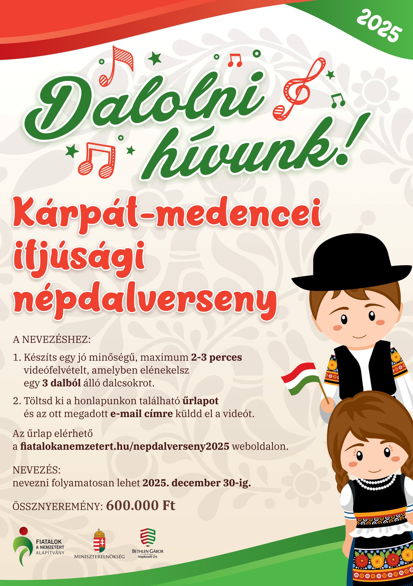 A Fiatalok a Nemzetért Alapítvány 2025 őszén ismét meghirdeti nagysikerű népdalversenyét, amelyre az egész Kárpát-medencéből várjuk a dalos kedvű általános és középiskolás fiatalok jelentkezését.